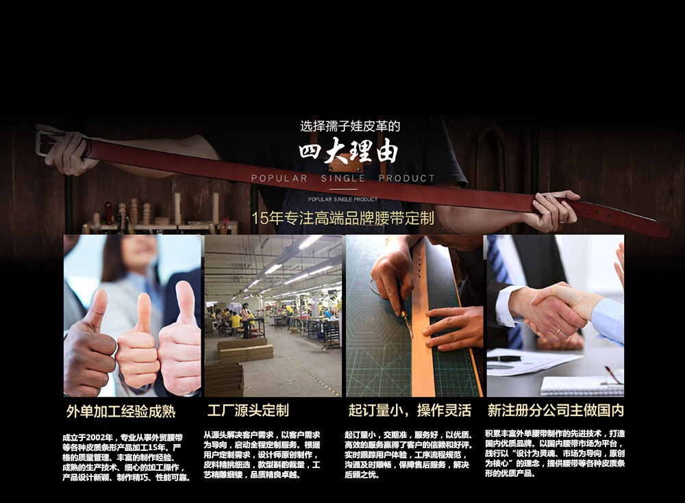 您好,歡迎來東莞市孺子娃皮革制品有限公司的網(wǎng)站!主營(yíng):男女真皮腰帶、寵物帶、皮具裝飾品,皮帶等多項(xiàng)產(chǎn)品生產(chǎn)、加工為一體